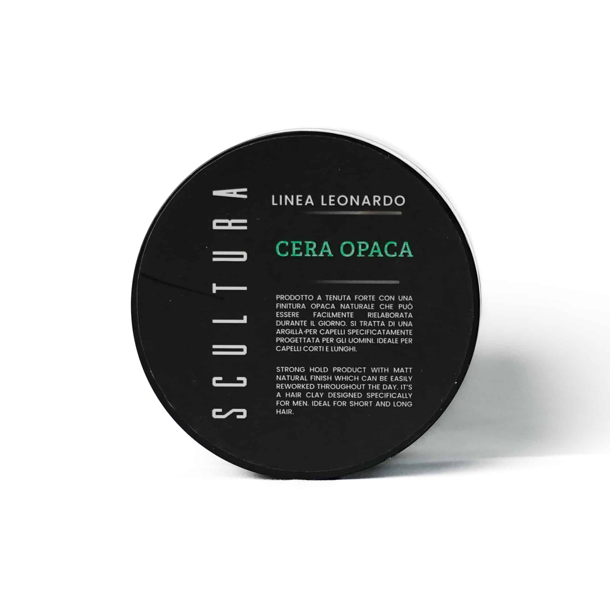Cera per capelli Leonardo a base d’acqua. Tenuta medio forte. Senza petrolio, non ingrassa i capelli. Applicare una piccola dose per donare un effetto naturale e creare una texture per effetti spettinati e non.